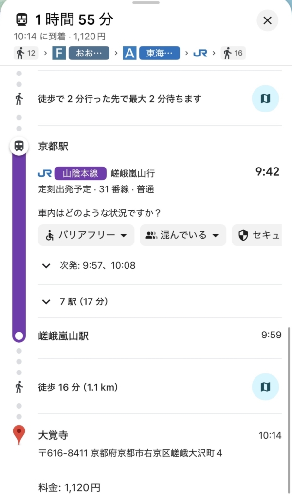 嵯峨嵐山から大覚寺までは徒歩16分ですが、結構遠いので、バスかタクシーもおススメです。