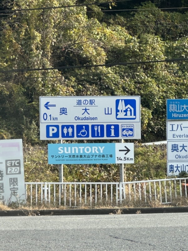 米子道の江府出口を降りた直ぐの交差点を左折するのですが、右折すると大阪で流通しているサントリー天然水の【奥大山】の採水地工場の看板がありました!